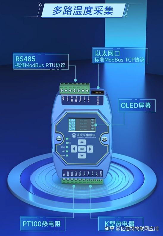 温度采集模块(我们的产品)+ 传感器(PT100或K型热电偶),将PT100或热电偶接入模块,屏幕即可显示温度,也可以通过485接口和PC,PLC等设备通信。