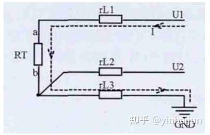 测量时导线电阻为 rL1、rL2、rL3,三条导线采用同规格同长度,因此;RT 为 PT100 阻值,测 量 端 U1 点 U2 点 的 测 量 电 路 采用高阻抗输入电路。 为测量 RT 的阻值,在 U1 端加入恒定电流I。