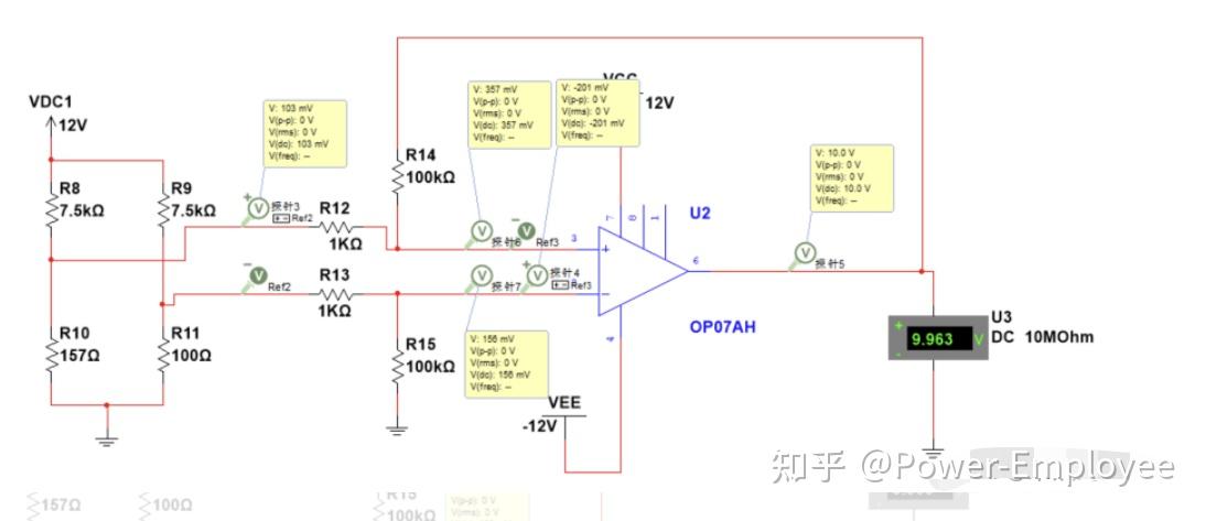 理想要的数值是10倍的放大倍数,但是现在在输出端多了减了V1,根据模拟的数值可知,V1的取值范围是0.215 - 0.对应温度范围是44.032 - 75.43