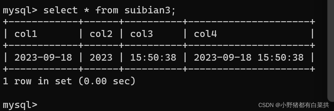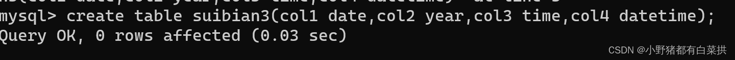 mysql> create table suibian3(col1 date,col2 year,col3 time,col4 datetime);