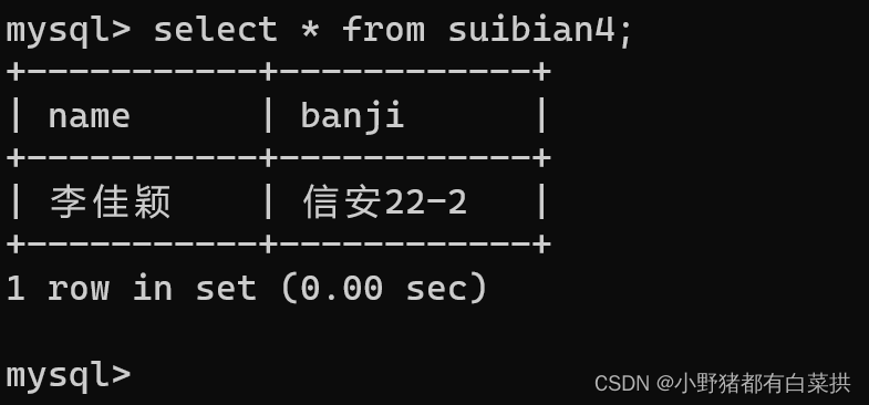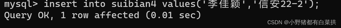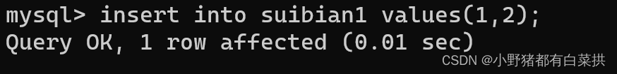 mysql> insert into suibian1 values(1,2) //用于将数据插入到名为 “suibian1” 的表中。具体来说,它表示向 “suibian1” 表中插入一行数据,该行包含两个值:1 和2。