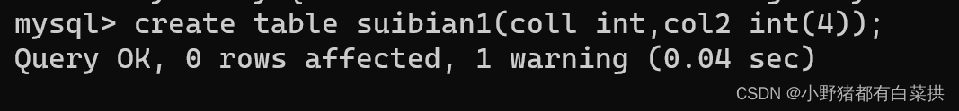 例题:创建测试表1,有col1和col2两个字段,其数值宽度分别为int和int(4)。