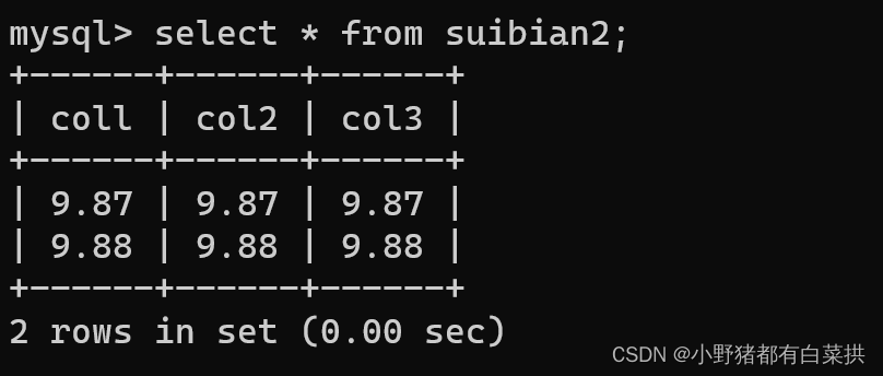 创建测试表2,有三个字段col1、co2和co3,数据类型分别为FLOAT(5,2)、DOUBLE(5,2)和DECIMAL(5,2))