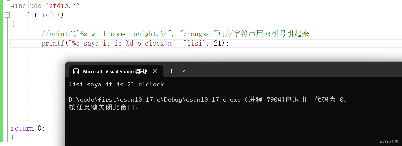 上面示例中,输出文本%s says it is %d o'clock有两个占位符,第一个是字符串占位符%s,第二个是整数占位符 %d ,分别对应printf()的第二个参数(lisi)和第三个参数(21)。执行后的输出就是lisi says it is 21 o'clock.