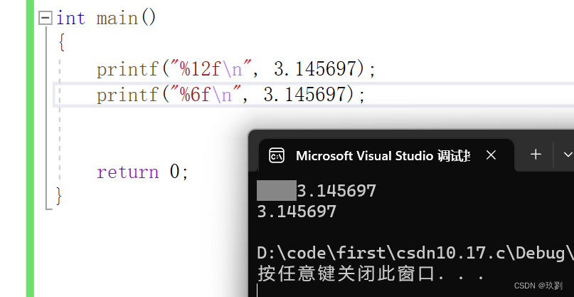 上面示例中的%12f表示输出的浮点数至少要占12位,由于小数点默认是6位,小数点‘.’也占一位,所以前面会添加三个空格。