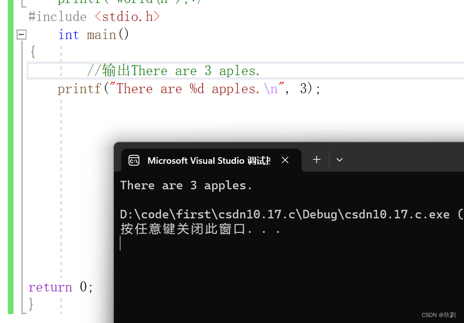 printf()的第二个参数就是替换占位符的值,上面的例子是整数3替换%d。执行后的输出结果就是There are 3 apples .