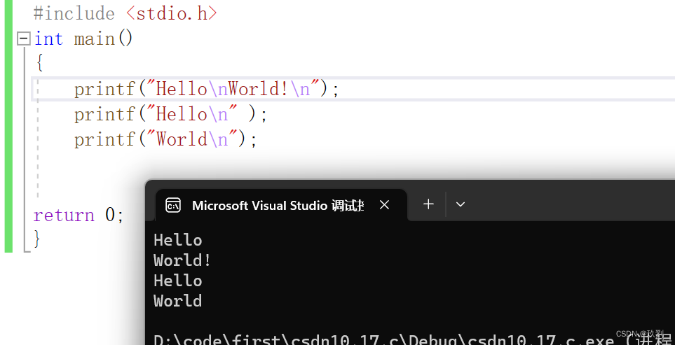printf() 不会在行尾自动添加换行符,运行结束后,光标就停留在输出结束的地方,不会自动换行。