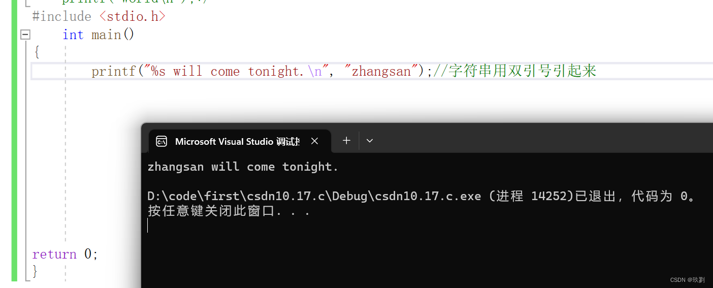 上面示例中,%s表示代入的是一个字符串,所以printf()的第二个参数就必须是字符串,这个例子是zhangsan,执行后的输出就是zhangsan will come etonight.