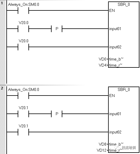 程序段2:V20.1从接通到断开这一过程的计时,计时结果(单位:毫秒)在VD12中查看。