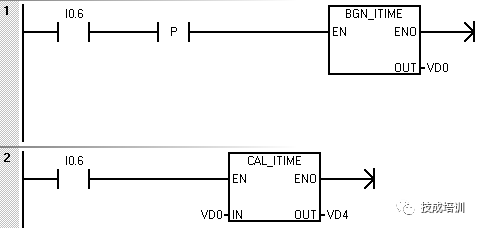 当程序段1中BGN_ITIM指令的EN导通一个扫描周期时,系统将会读取该扫描周期内接通的具体时间,存放在OUT地址VD0中。同时程序段2中CAL_CITIM指令会计算OUT中地址VD4和IN端地址VD0的差值,从而得到EN端接通的实际时间,并且该时间单位为毫秒。