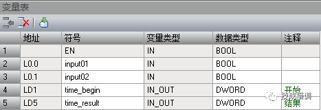时间间隔指令实际应用比较少,通过子程序进行时间的记录,采用时间间隔指令是其中一种方法,在使用该方法时,需要注意两点:一是在BGN_ITIM指令的EN端需要使用脉脉冲信号触发,而在子程序中又不能使用沿脉冲信号,因此在主程序对该形式参数赋实参时,务必加沿脉冲指令,否则CAL_CITIM指令OUT将没有值。二是CAL_CITIM指令OUT地址为DWORD数据类型,并且单位为毫秒,需要进行二次运算后才是我们实际需要的运行时间。