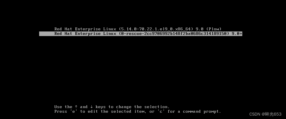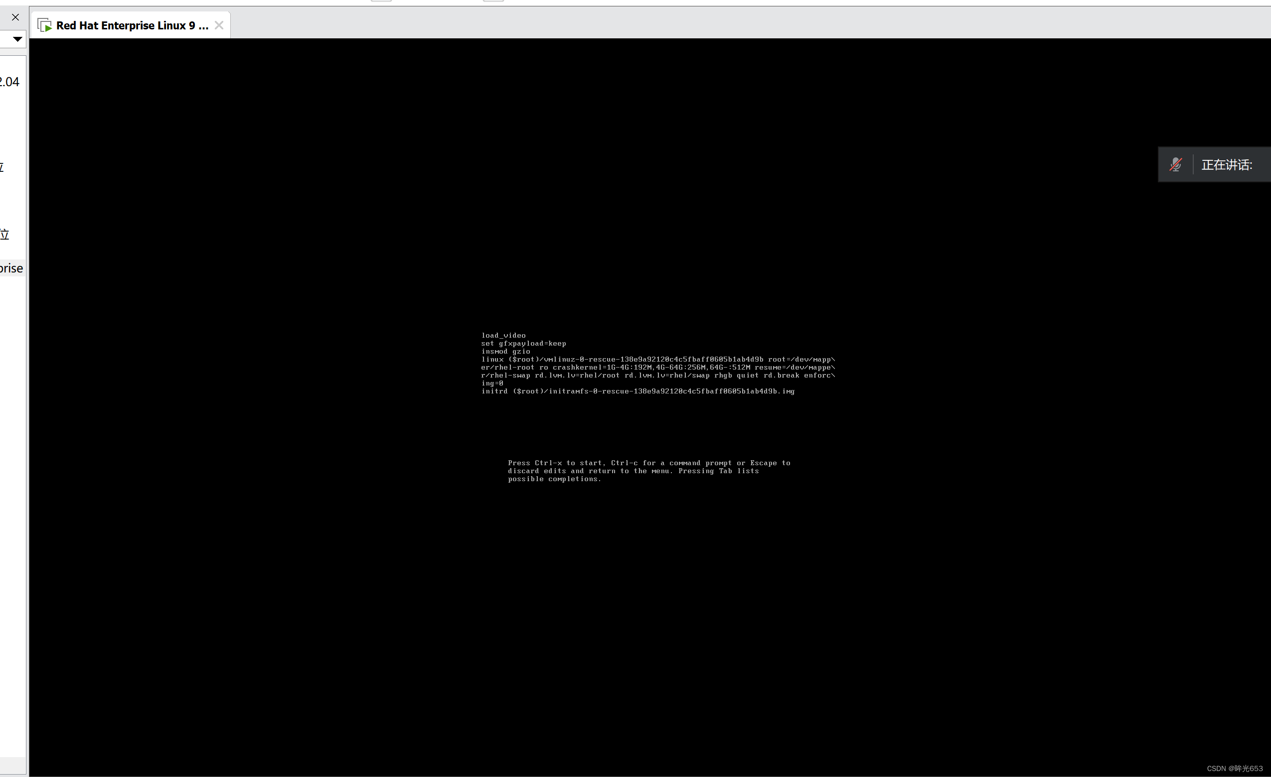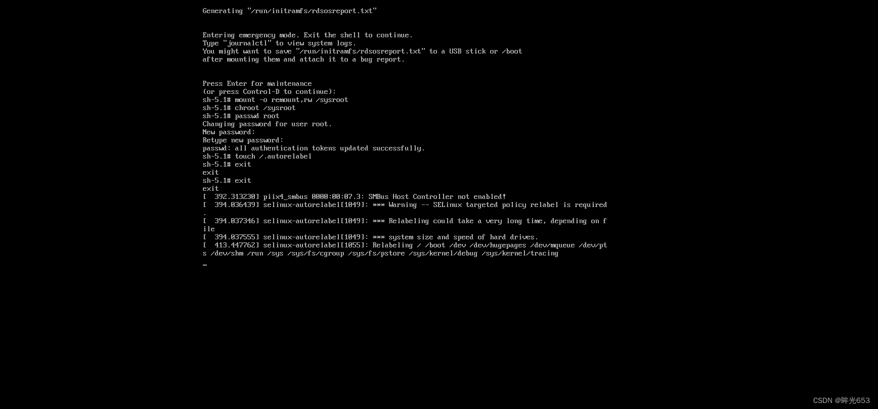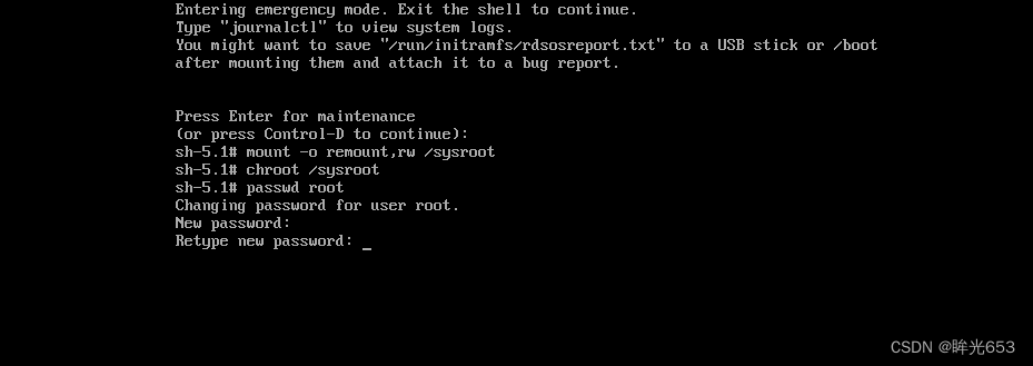 d. break 这种方法一般用于修改 root密码或者出现重大问题, 临时中断运行, 未装载往何文件系统, 比上述救援模式还要精简。 如果使用rd. break不能进入系统启动,我们则可以向内核传递“init=/bin. bash”或‘nit=/bins参数, 使用 Shell 替代默认的 daemon 进程来重置 root密码。参照上一小节的操作进入Shel引导界面,再继续以下步骤。