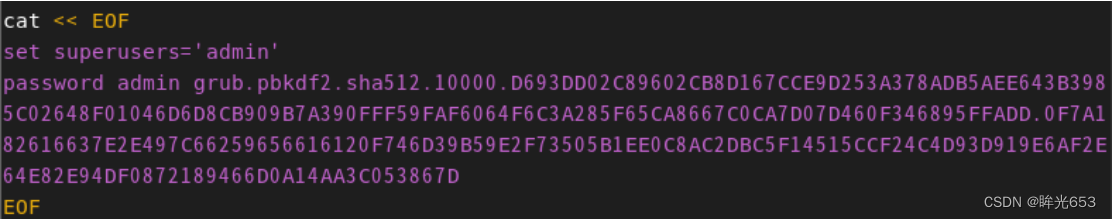 4https://huaweicloud.csdn.net/etc/grub.d/00_header文件的password语句中的密码更换成上述以grub.pbkdf2.sha开头的密文。最后执行命令