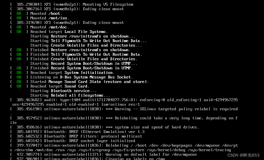 如果系统启动了 SELinux, 必须执行以下命令, 否则将无法正常启动系统: