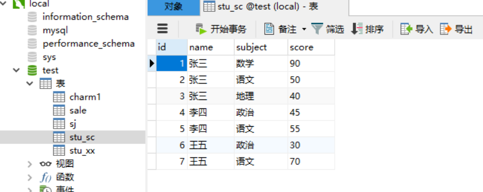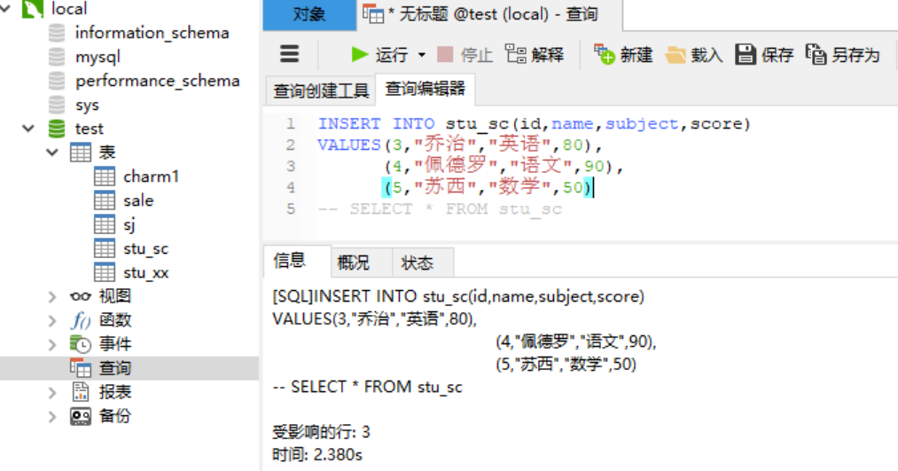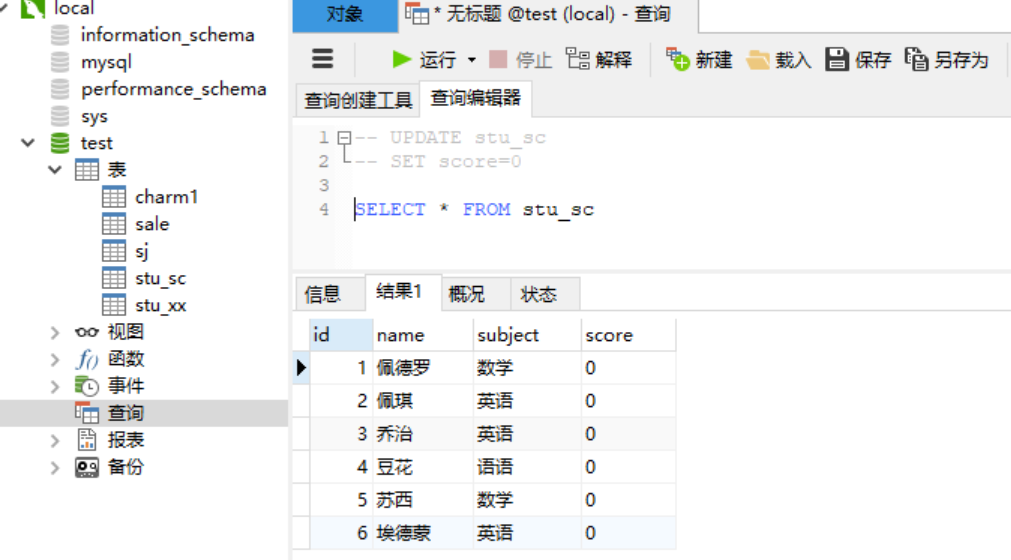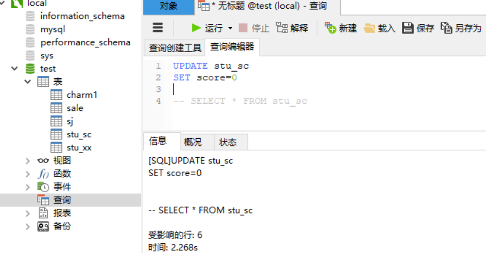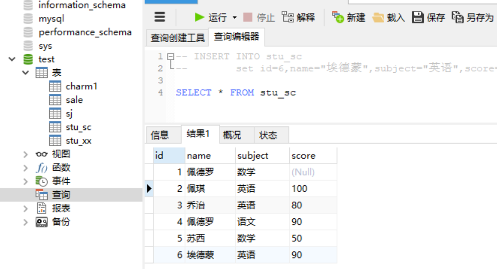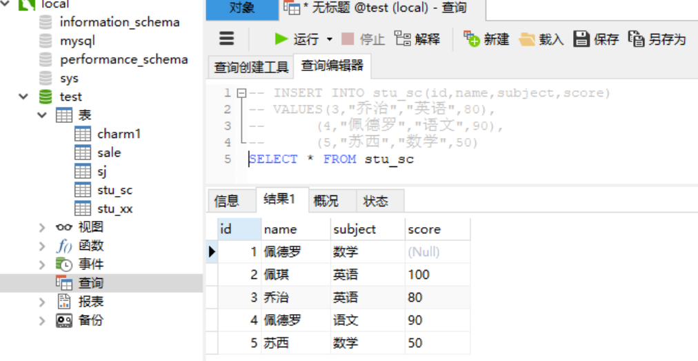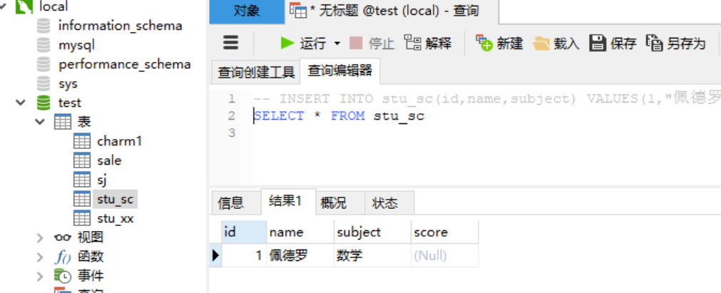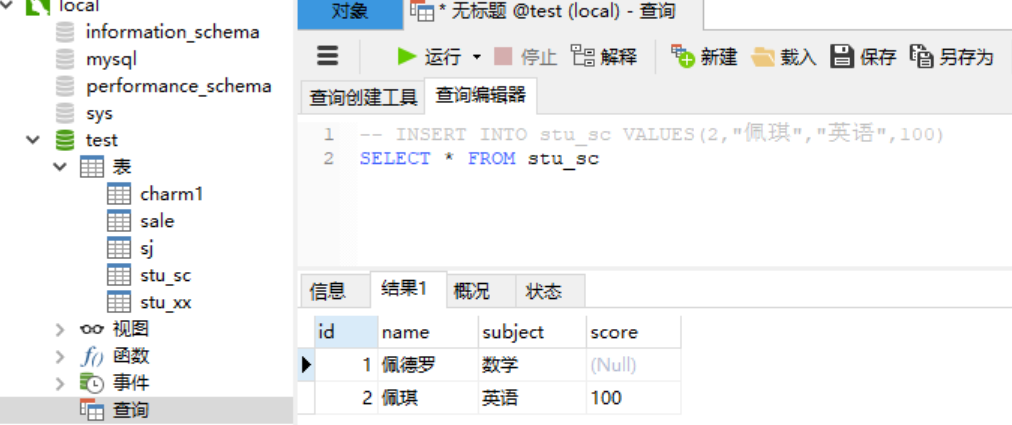在进行“增删改查”的操作之前,先建立一个包含数据表的数据库,命名为stu_sc