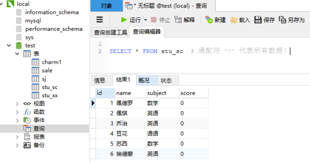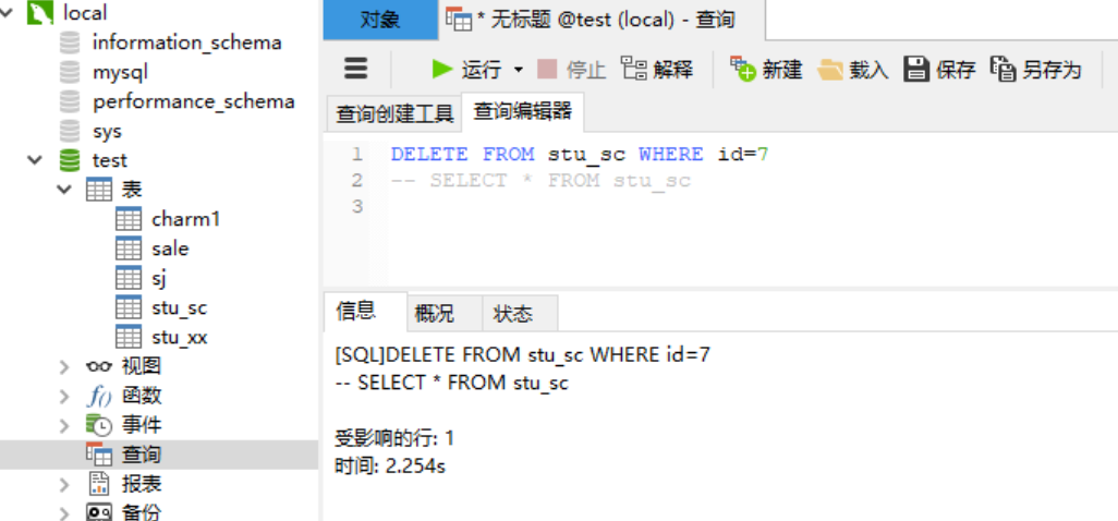 然后,使用SELECT * FROM stu_sc查看!第7行数据删除掉了。