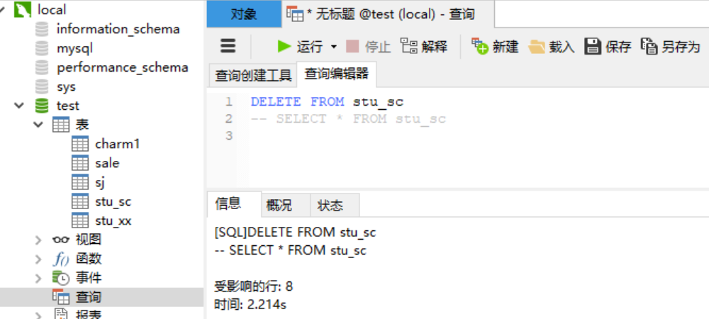 然后,使用SELECT * FROM stu_sc查看,发现有8行数据全部删除了。