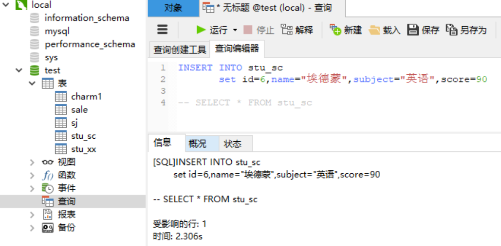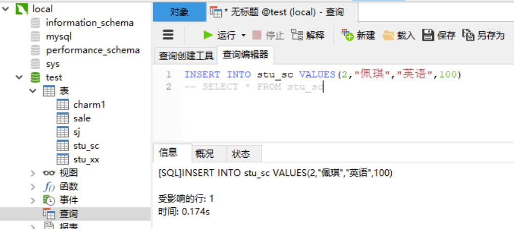 然后,使用SELECT * FROM stu_sc查看。增加了一行(第9行)信息。