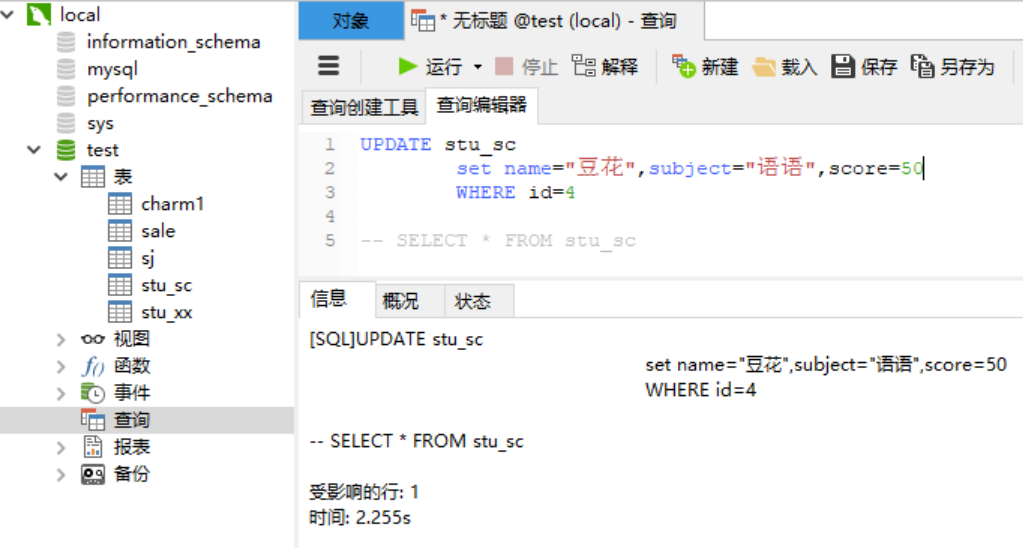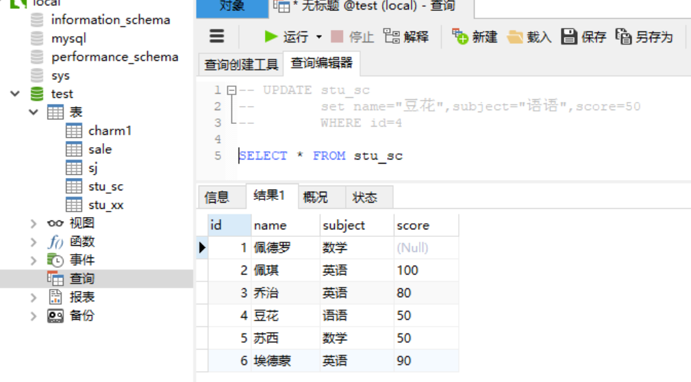 需求:将stu_sc表中,id=4的name改为“豆花”,score改为50。