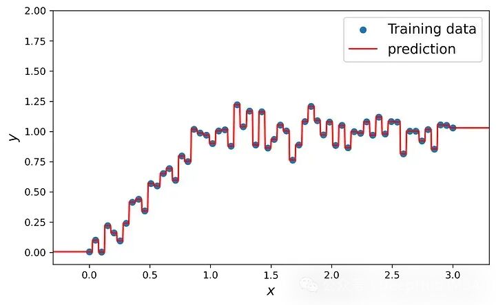 X_space = np.linspace(-0.3, 3.3, 1000).reshape(-1, 1)tree_regres = DecisionTreeRegressor(random_state=1)tree_regres.fit(X, y)yhat = tree_regres.predict(X_space)plt.figure(figsize=(8,6))plt.scatter(X, y, label=“Training data”)plt.plot(X_space, yhat, color=“red”, label=“prediction”)plt.xlim([-0.3, 3.3])plt.ylim([-0.1, 2])plt.legend(loc=“best”, fontsize=14)plt.xlabel(’\(x\)’, fontsize=14)plt.ylabel(’\(y\)’, fontsize=14)ax = plt.gca()ax.set_aspect(‘equal’)plt.show()
