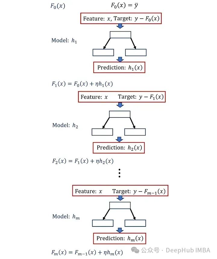 class GradBoostingRegressor():def init(self, num_estimators, learning_rate, max_depth=1):self.num_estimators = num_estimatorsself.learning_rate = learning_rateself.max_depth = max_depthself.tree_list = []def fit(self, X, y):self.F0 = y.mean()Fm = self.F0for i in range(self.num_estimators):tree_reg = DecisionTreeRegressor(max_depth=self.max_depth,random_state=0)tree_reg.fit(X, y - Fm)Fm += self.learning_rate * tree_reg.predict(X)self.tree_list.append(tree_reg)def predict(self, X):y_hat = self.F0 + self.learning_rate * </span>np.sum([t.predict(X) for t in self.tree_list], axis=0)return y_hat
