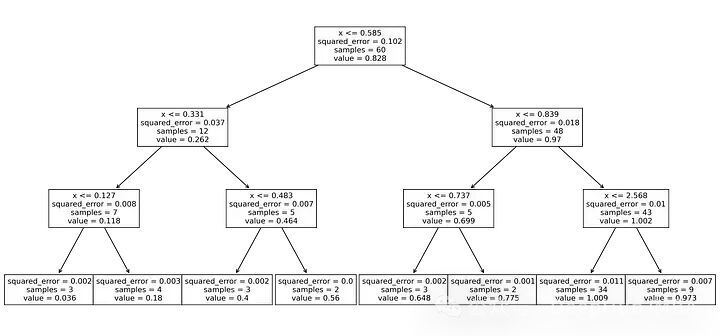 tree_regres = DecisionTreeRegressor(random_state=0, max_depth=3)tree_regres.fit(X, y)plt.figure(figsize=(17,8))tree.plot_tree(tree_regres, fontsize=10, feature_names=[“x”]) plt.show()