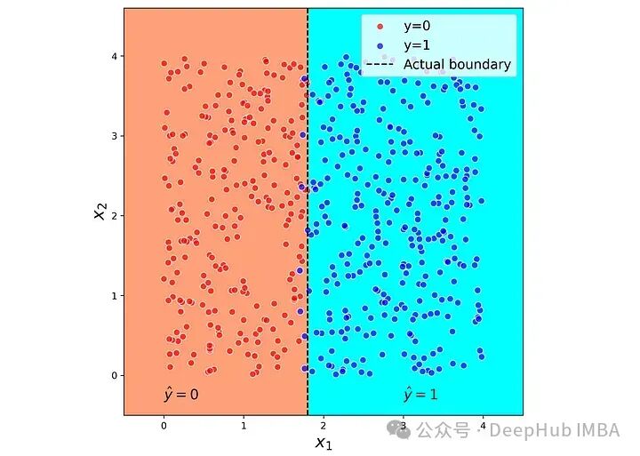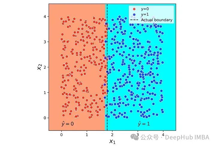 #Listing 9plt.figure(figsize=(6,6))plot_boundary(X, y, tree_clf, lims=[-1, 5, -1, 5])plt.axvline(x=1.8, color=“black”, linestyle=“–”, label=“Actual boundary”)plt.text(0, -0.3, r”\(\hat{y}=0\)”, fontsize=13)plt.text(3, -0.3, r”\(\hat{y}=1\)”, fontsize=13)ax = plt.gca()ax.set_aspect(‘equal’)plt.xlim([-0.5, 4.5])plt.ylim([-0.5, 4.5])plt.xlabel(’\(x_1\)’, fontsize=16)plt.ylabel(’\(x_2\)’, fontsize=16)plt.legend(loc=“best”)plt.show()