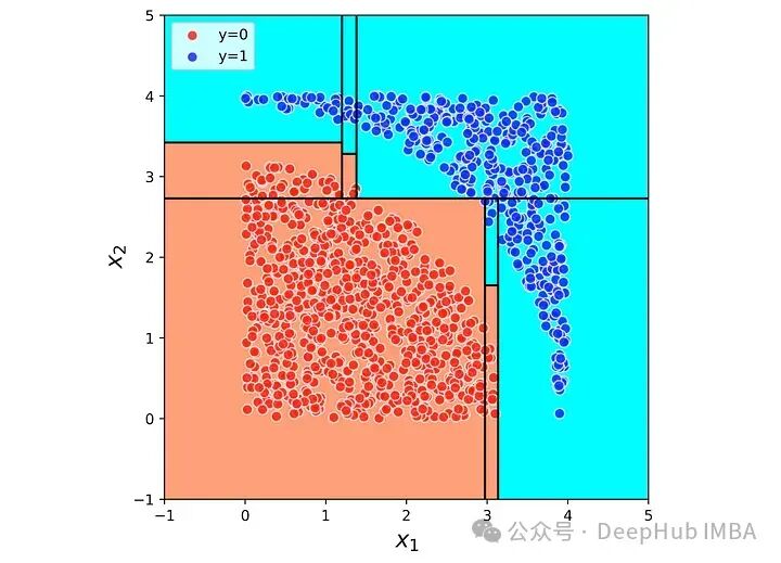 plt.figure(figsize=(6,6))plot_boundary(X, y, tree_clf, lims=[-1, 5, -1, 5])plot_boundary_lines(tree_clf)ax = plt.gca()ax.set_aspect(‘equal’)plt.xlim([-1, 5])plt.ylim([-1, 5])plt.xlabel(’\(x_1\)’, fontsize=16)plt.ylabel(’\(x_2\)’, fontsize=16)plt.show()