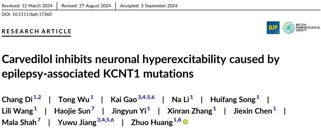 2024年10月,我院天然药物及仿生药物全国重点实验室黄卓研究团队和北京大学第一医院姜玉武研究团队、英国伦敦大学学院Mala Shah研究团队共同在药理学高影响力期刊British Journal of Pharmacology杂志在线发表题为“Carvedilol inhibits neuronal hyperexcitability caused by epilepsy-associated KCNT1 mutations” 的研究论文,该研究发现常用于治疗高血压的药物卡维地洛,能够有效抑制由钾离子通道KCNT1基因突变引起的神经元过度兴奋,并进一步抑制小鼠癫痫发作,为治疗由KCNT1基因突变引起的癫痫提供了新的治疗途径。