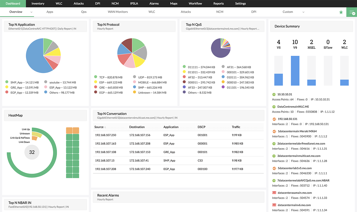使用这个网络流量分析系统,您可以查看当前的流量模式,以及关于主机、应用和生成流量的对话的详细信息。此外,通过报告,您可以分析网络流量趋势,以确定高峰使用时间、链接利用率指标等。NetFlow analyzer还执行深入的网络包分析,为您提供应用使用、协议使用和其他使用趋势的整体视图。