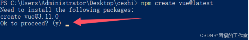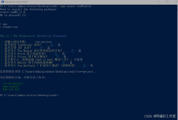 2.在命令行中输入以下命令: npm create vue@latest 回车,出现下图这种一直回车