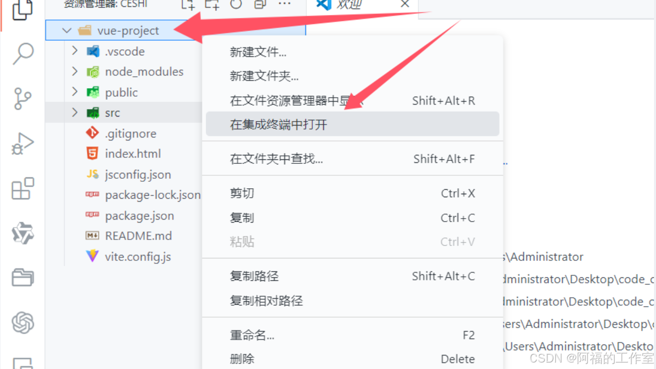 那么先右键最顶部文件夹+打开终端输入npm run dev即可