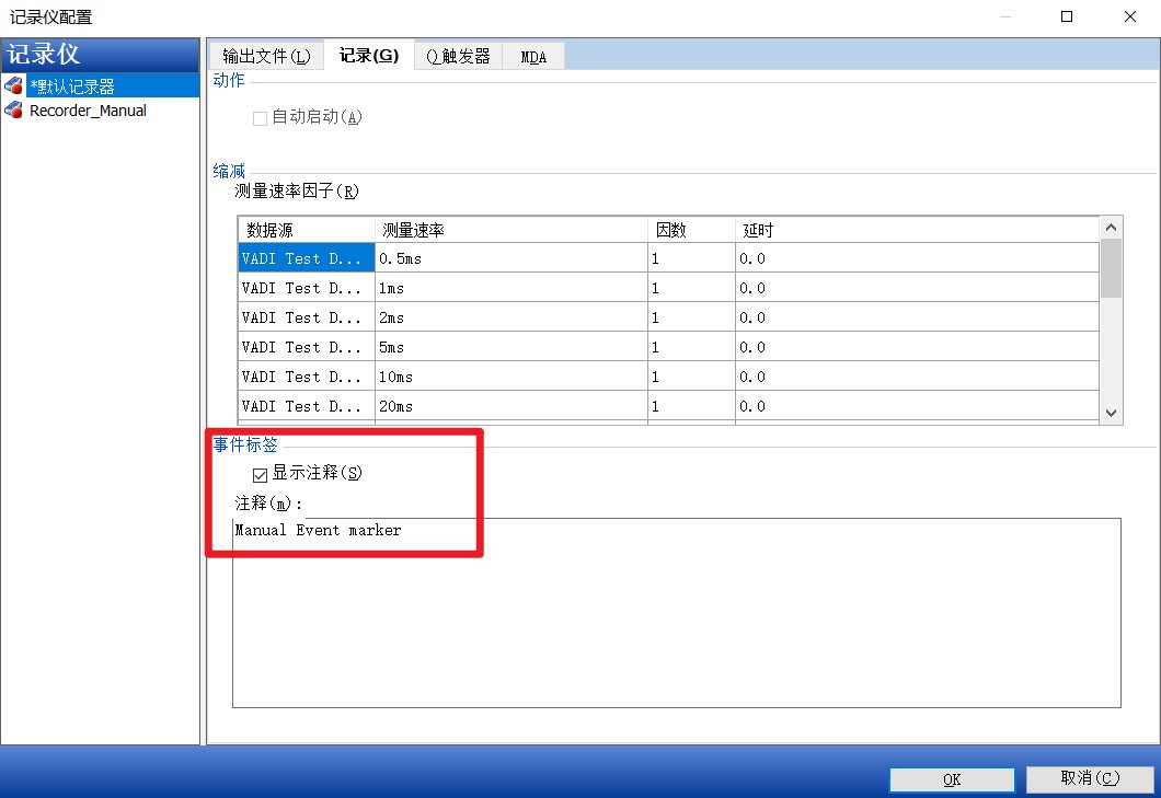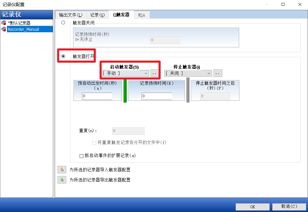 (1)打开记录仪配置(Ctrl+Q),选择Recorder_Manual的“触发器”选项卡;