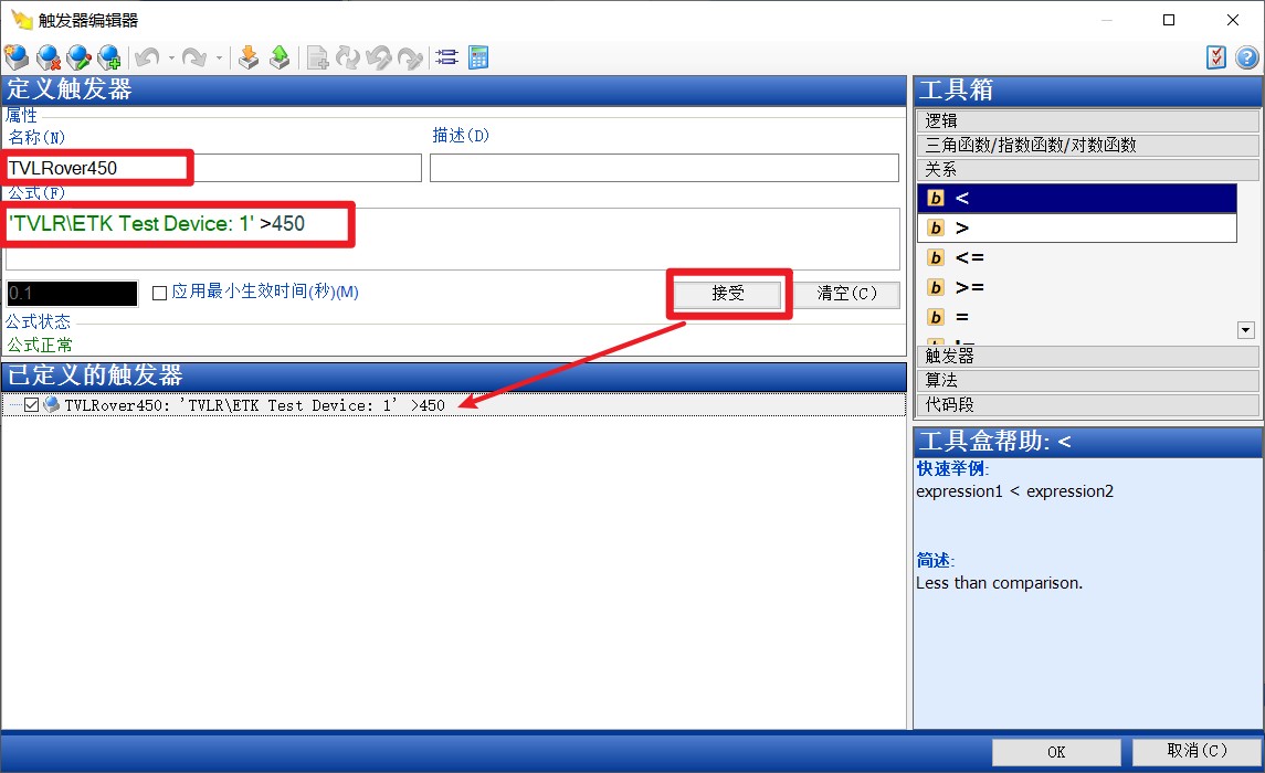 (5)然后在右侧工具箱中选择关系选项卡,选择大于号,并在后方输入数字450,然后选择“接受”,保存触发器;退出触发器编辑器界面;
