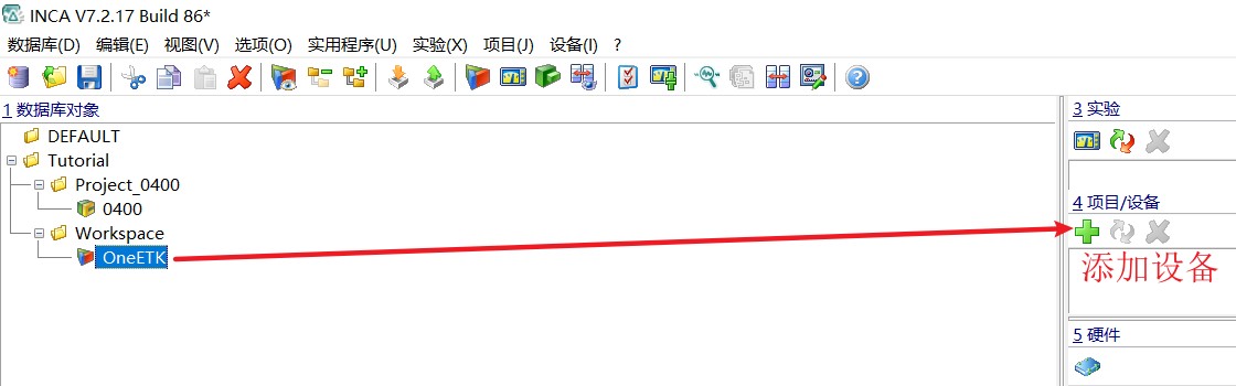 (3)选中“1数据库对象”中的工作区(OneETK),点击“4项目/设备”中的“添加项目/数据集”,之后会跳出一个对话框;