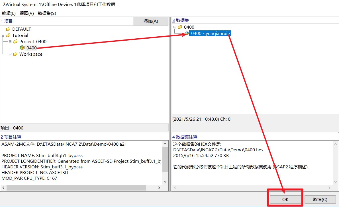 (4)在对话框的“1项目”区域,选择刚才建立的项目(Project_0400),并在“3数据集”区域选择数据集,单击OK;