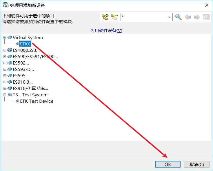 (5)自动跳出一个添加设备的对话框,先选择Virtual System中的ETKC虚拟硬件。