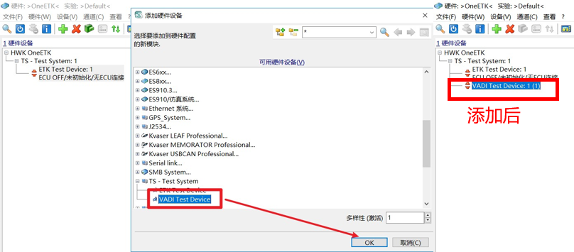 (1)在“4项目/设备”区域的右框中选择“ETKC:1”,右键→新设备,选择TS-Test System中的ETK Test Device。