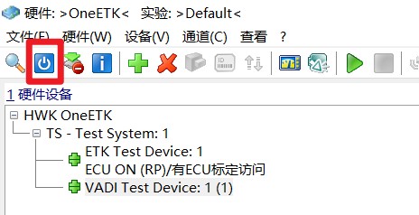 注意在“1硬件设备”区域中设备前面的红色断开图标,表示设备已指定,但尚未激活。要激活这些设备,必须先进行初始化。初始化后,INCA将会建立和所有设备的连接。初始化成功的设备,图标会变成一个带有向上箭头的标志,表示设备处于活动状态。