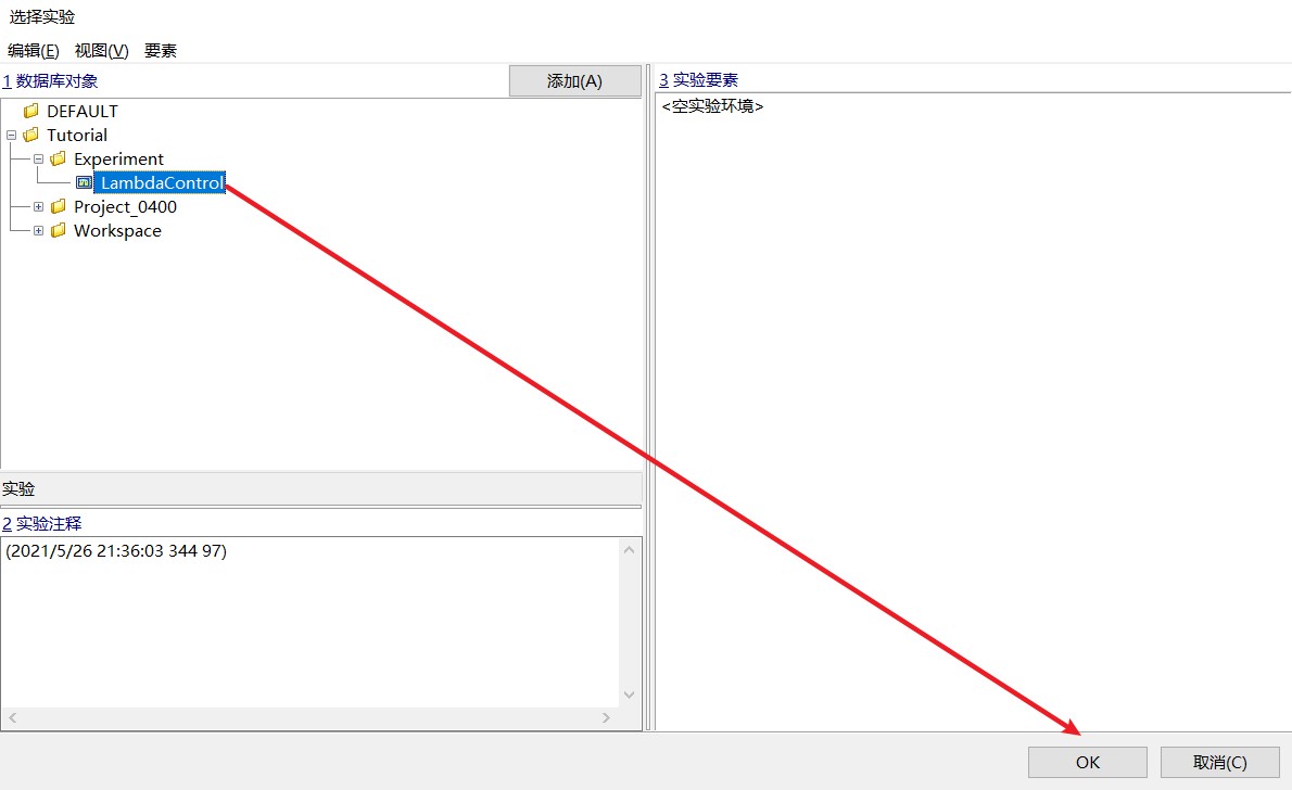 (2)选中工作区(OneETK),在“3实验”区域选择“更改实验”,之后会跳出一个对话框,选择“1数据库对象”区域中的实验,然后点击OK;