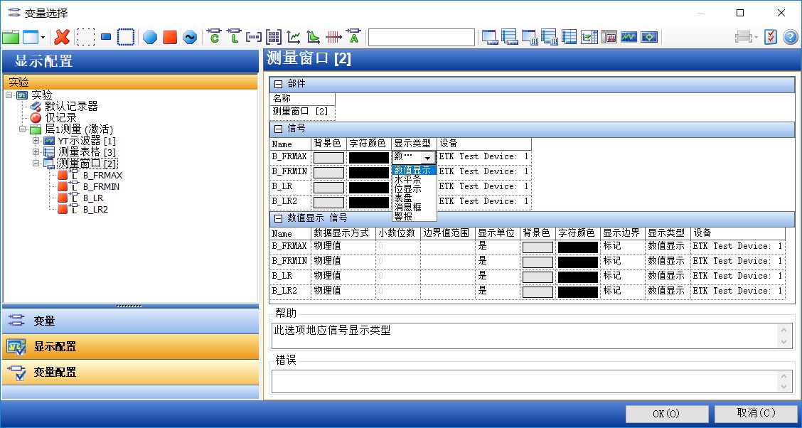 (2)选择“测量窗口”,将以“B”开头的变量的显示类型从“数值显示”更改为“位显示”,双击显示类型即可出现下拉菜单。