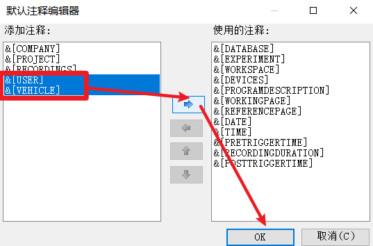 (5)在“添加注释”区按住Ctrl键并选择“[USER]”和“[VEHICLE]”,然后将其添加到“使用的注释”区;
