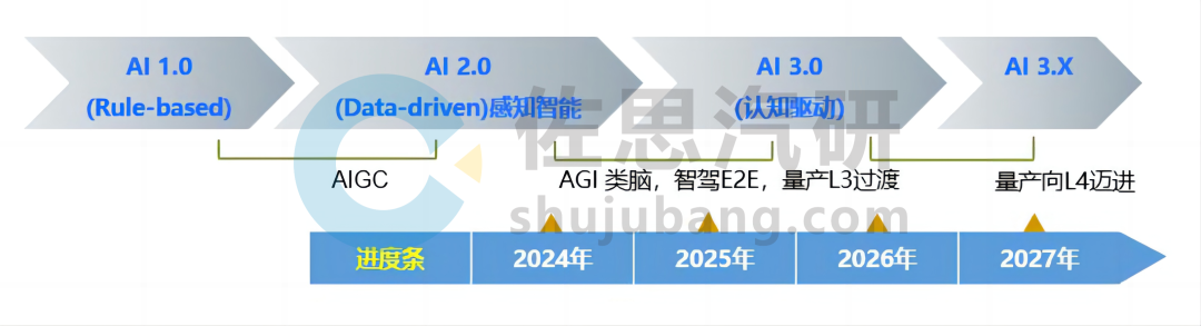 随着自动驾驶引入软件2.0、端到端技术,智驾开发模式从基于规则的分任务模块,进化到以数据驱动的AI 2.0阶段,目前正逐步向着AGI通用人工智能的AI 3.0迈进。