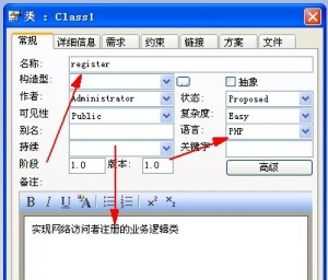 然后可以加入一些角色和用例,在每次在工具箱里面拉出一个元件,都将打开这个元件的设置对话框,在对话框内填入元件的名称等信息。现在我们是表达一个用户注册和登录的场景: