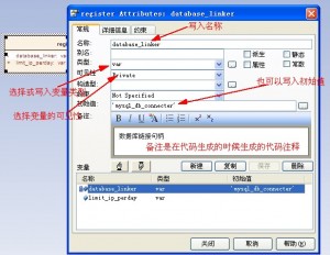 在生成类后,我们可以加入一些变量(在类元件上右键“变量”),变量主要将保存类本身的一些数据,如同人的性别,年龄等数据特征一样。比如我们注册类,也有数据链接的变量(它需要知道自己是和哪个数据库打交道的),还可能有着每IP单日注册数量限制的数据变量等等。