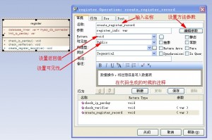 类还需要加入方法(在类元件上右键“方法”),比如说注册类中,需要检查输入的验证码,需要进行数据操作,需要检查单日注册数量等等。在类的方法里面,我们还可以设置每个方法的参数,参数类型,还有参数的备注,这将在代码工程内,直接作为参数和方法的注释生成到代码文件内。