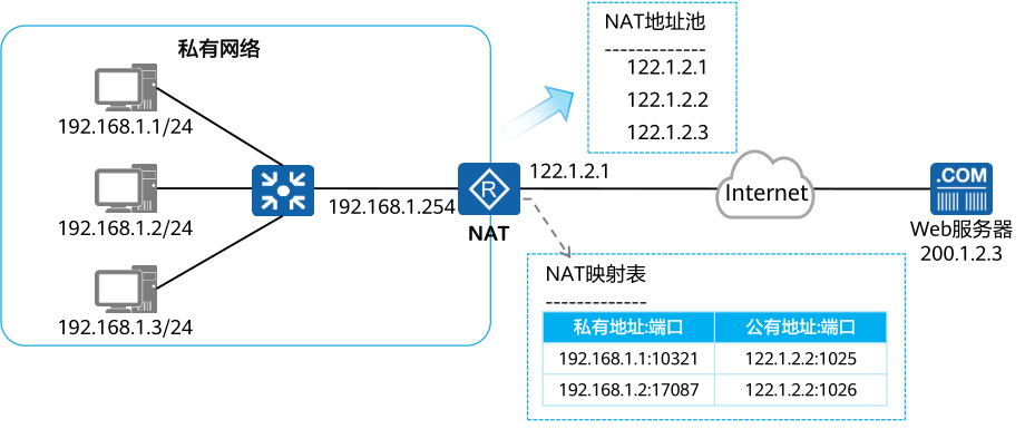 NAT 设备位于私有网络和公共网络之间,其工作方式如下: