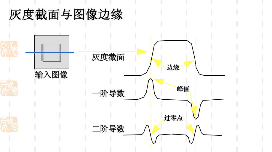 - 图像的二阶导数在边缘处取零值,且在零值的左右两侧分别存在极性相反的两个波峰;其波峰的大小和走向反映了边缘点的强度和方向。