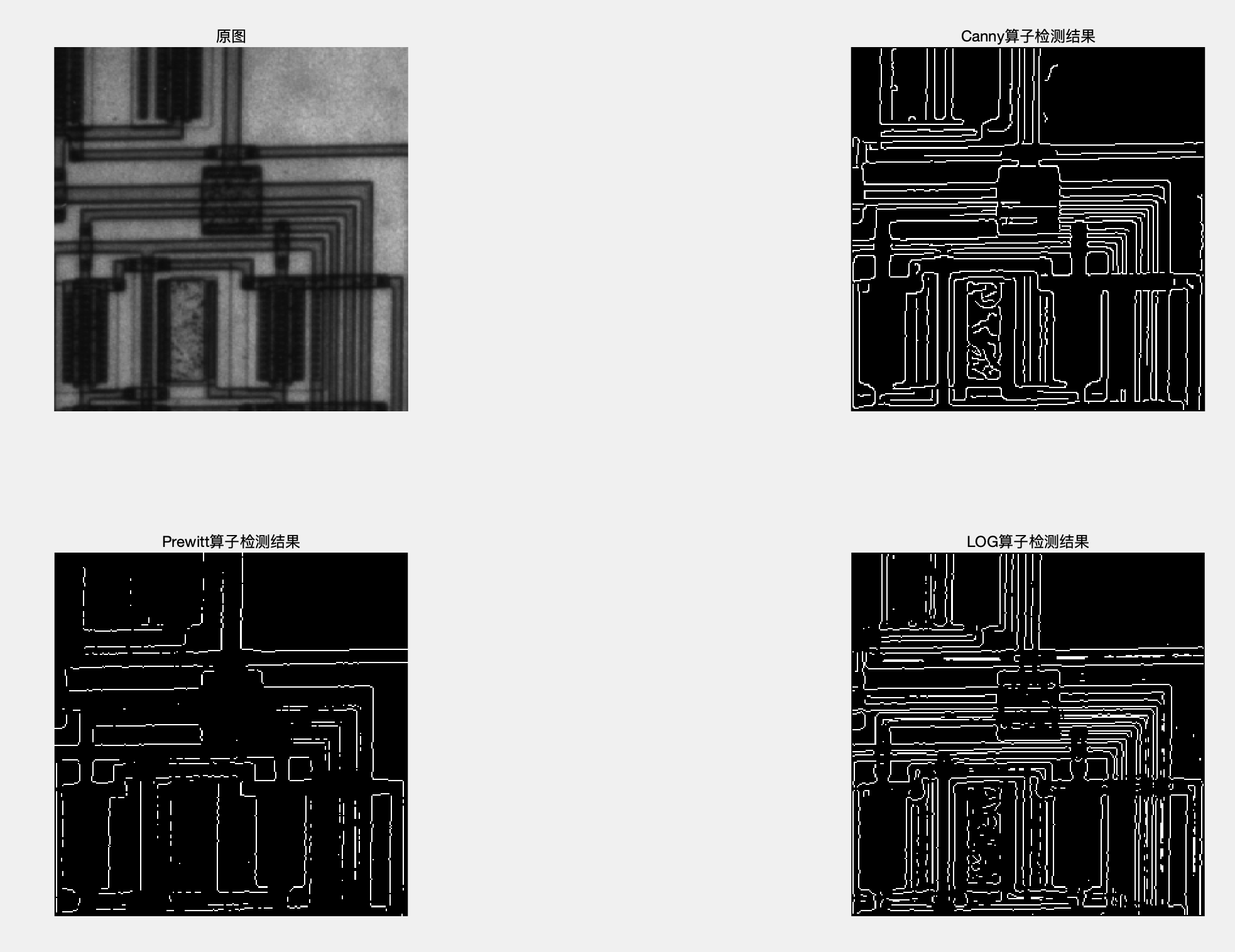 讯享网clear;clc;close all I=imread('circuit.tif'); subplot(221); imshow(I);title('原图'); subplot(222); BW1=edge(I,'Canny'); imshow(BW1);title('Canny算子检测结果'); subplot(223); BW2=edge(I,'Prewitt'); imshow(BW2);title('Prewitt算子检测结果'); subplot(224); BW3=edge(I,'log'); imshow(BW3);title('LOG算子检测结果');
