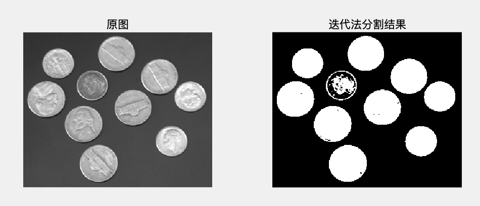 I=imread('coins.png'); figure subplot(121); imshow(I);title('原图'); I=double(I); T=(min(I(:))+max(I(:)))/2; done=false; i=0; while ~done r1=find(I<=T); r2=find(I>T); Tnew=(mean(I(r1))+mean(I(r2)))/2; done=abs(Tnew-T)<1; %if T==Tnew? T=Tnew; i=i+1; end I(r1)=0; I(r2)=1; subplot(122); imshow(I);title('分割结果');